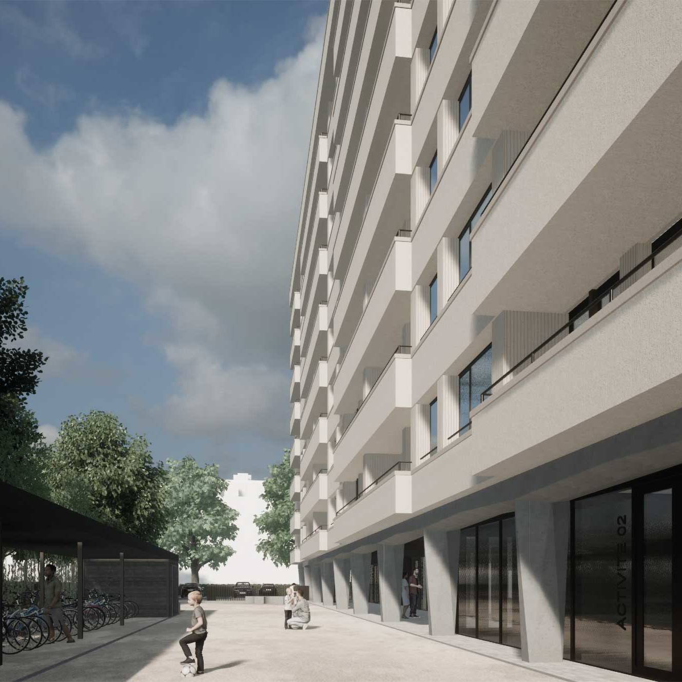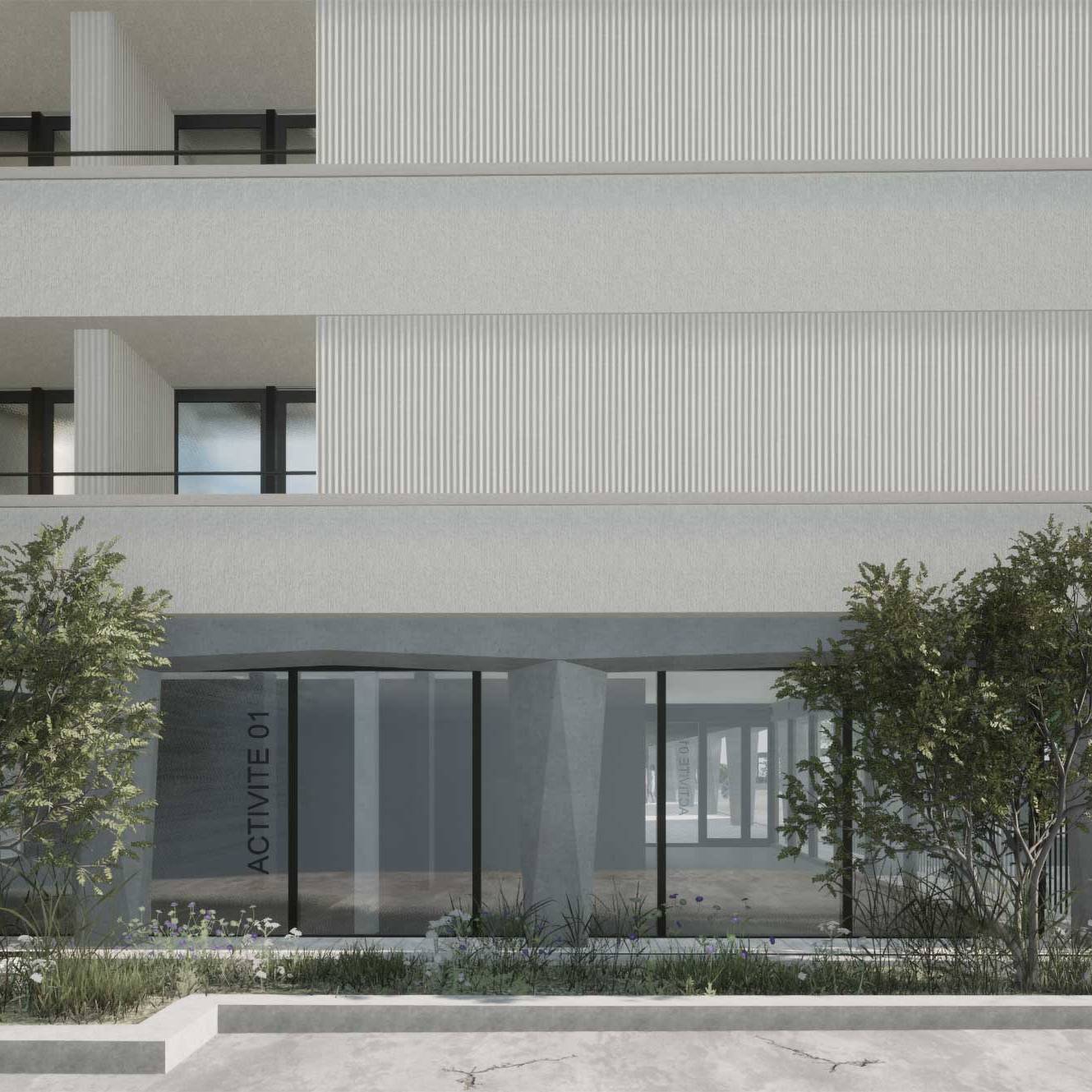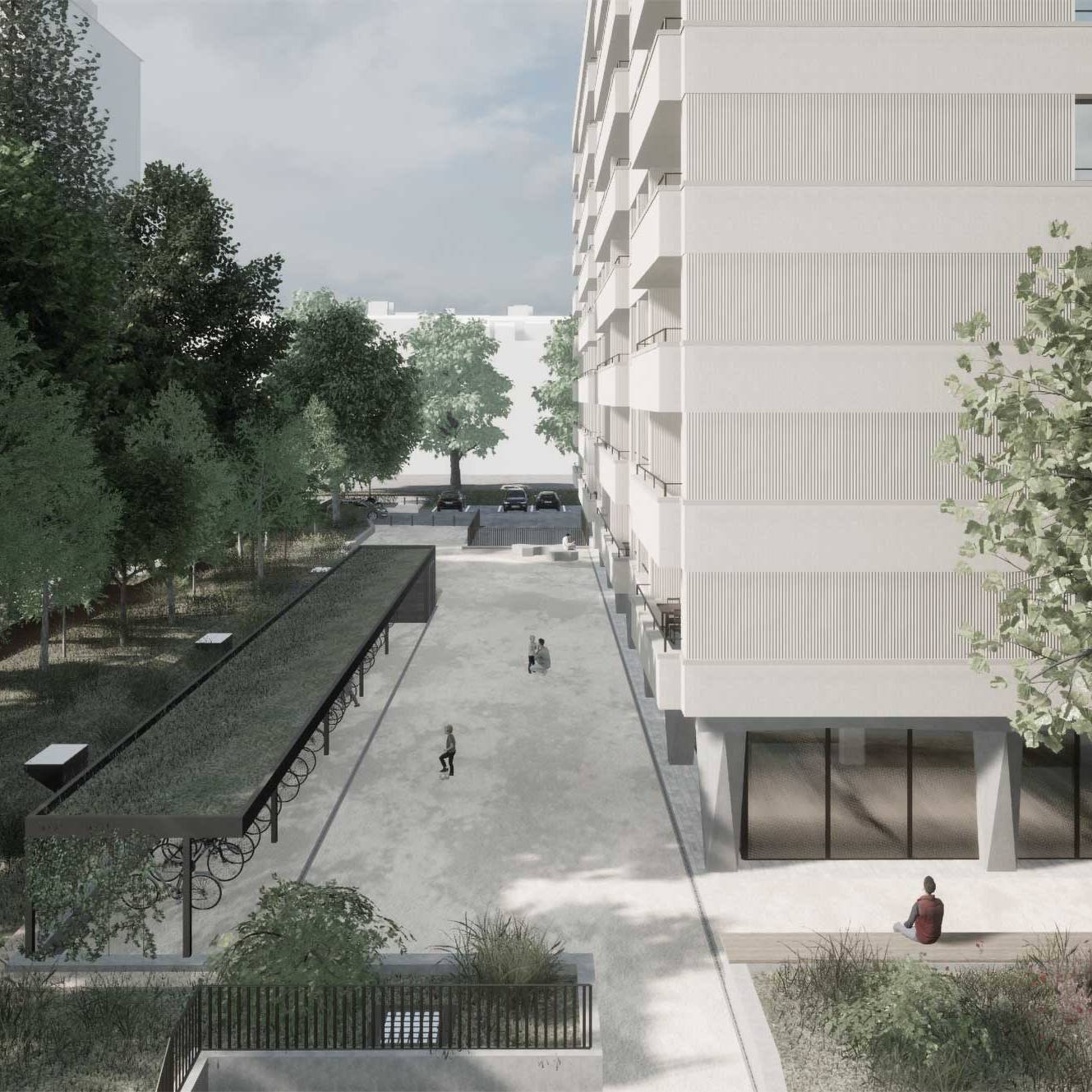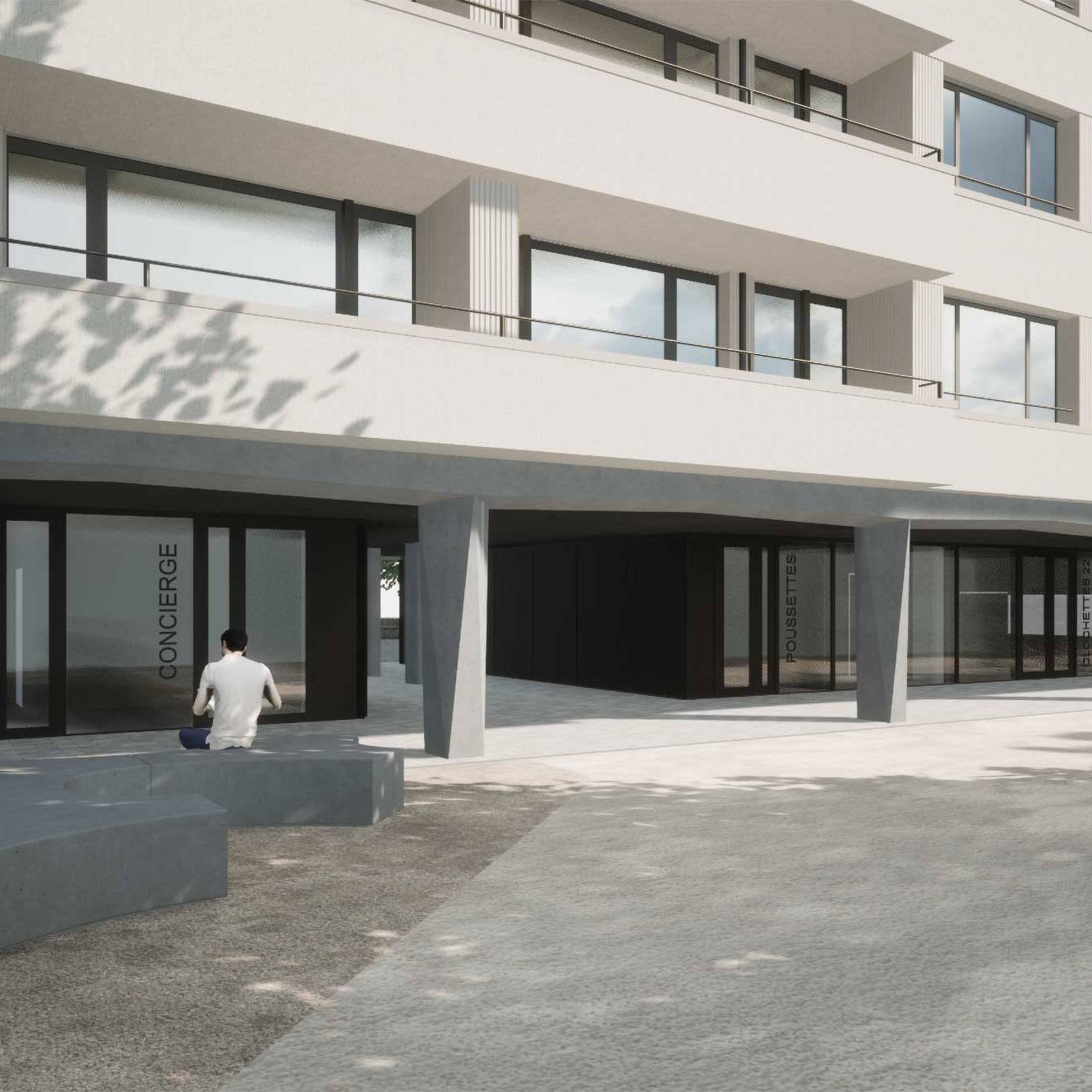 Les rez-de-chaussée sont repensés pour renforcer la convivialité et l’ouverture sur le quartier, avec une salle polyvalente, des locaux fonctionnels et des espaces d’activités ouverts au public. La mobilité douce est favorisée grâce à 73 places vélo, dont 45 pour la surélévation, et une réorganisation des caves. Les parkings voitures et deux-roues motorisés restent limités, privilégiant un mode de vie urbain centré sur les déplacements doux.
