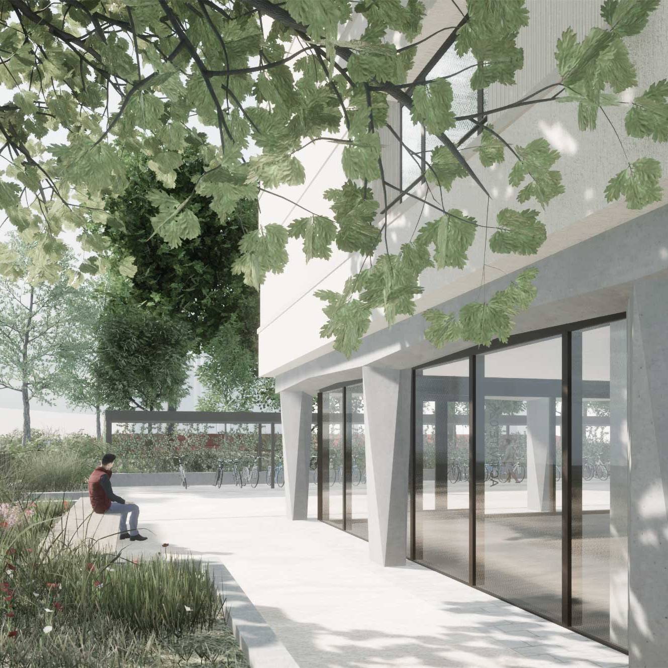 La sécurisation du parking souterrain permet de repenser les abords avec un projet paysager intégrant plantations compensatoires, cordon boisé et dispositifs pour la biodiversité. De nouveaux