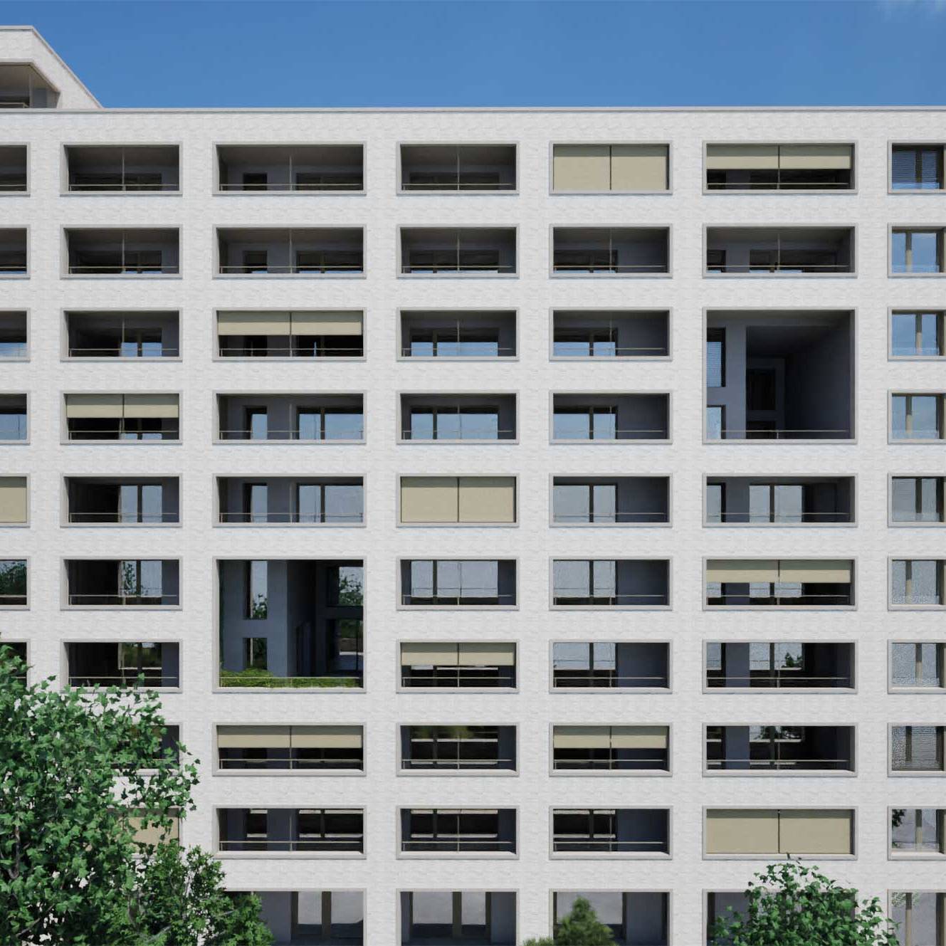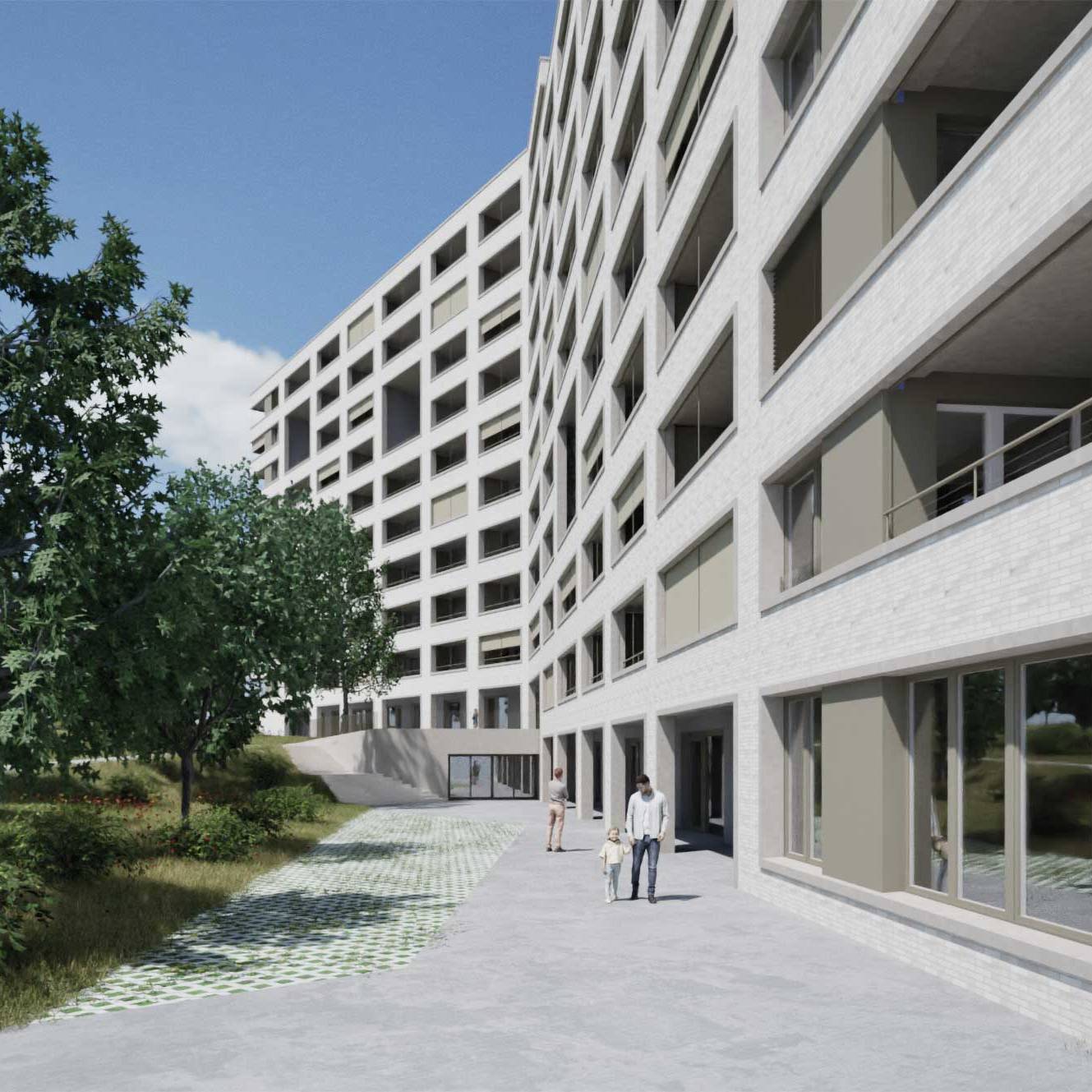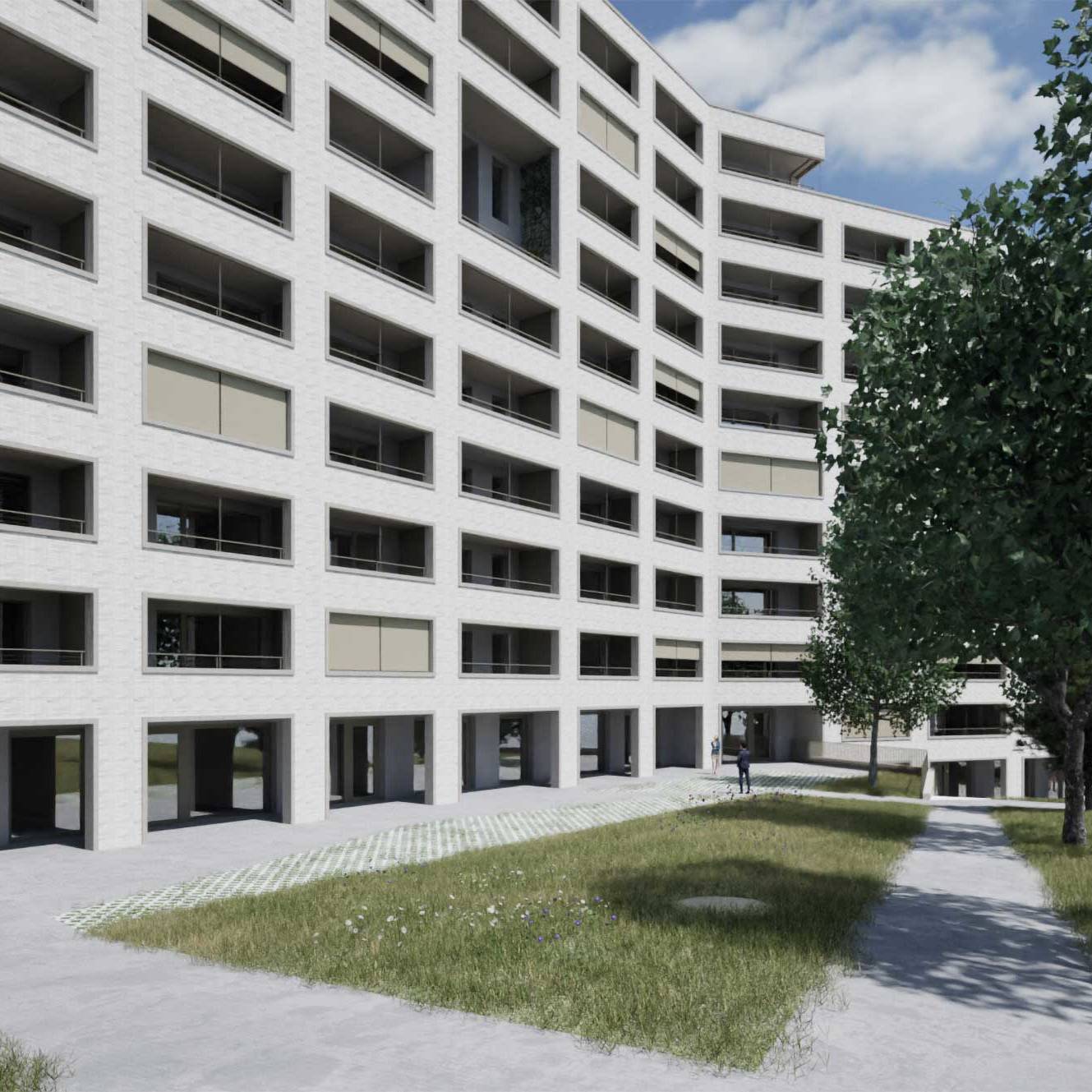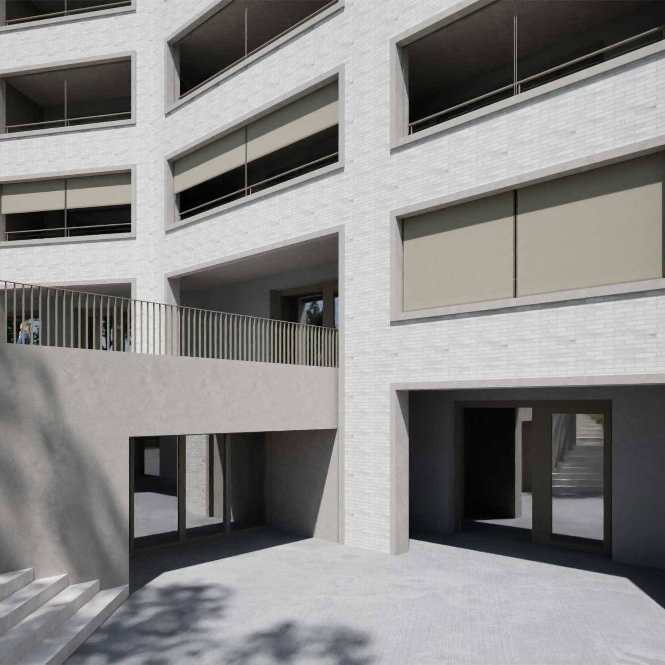 Avec sa volumétrie compacte et son implantation centrale, le bâtiment E devient un repère du quartier. Ses façades, animées par un jeu régulier d’ouvertures, offrent une lecture architecturale unifiée et contemporaine.