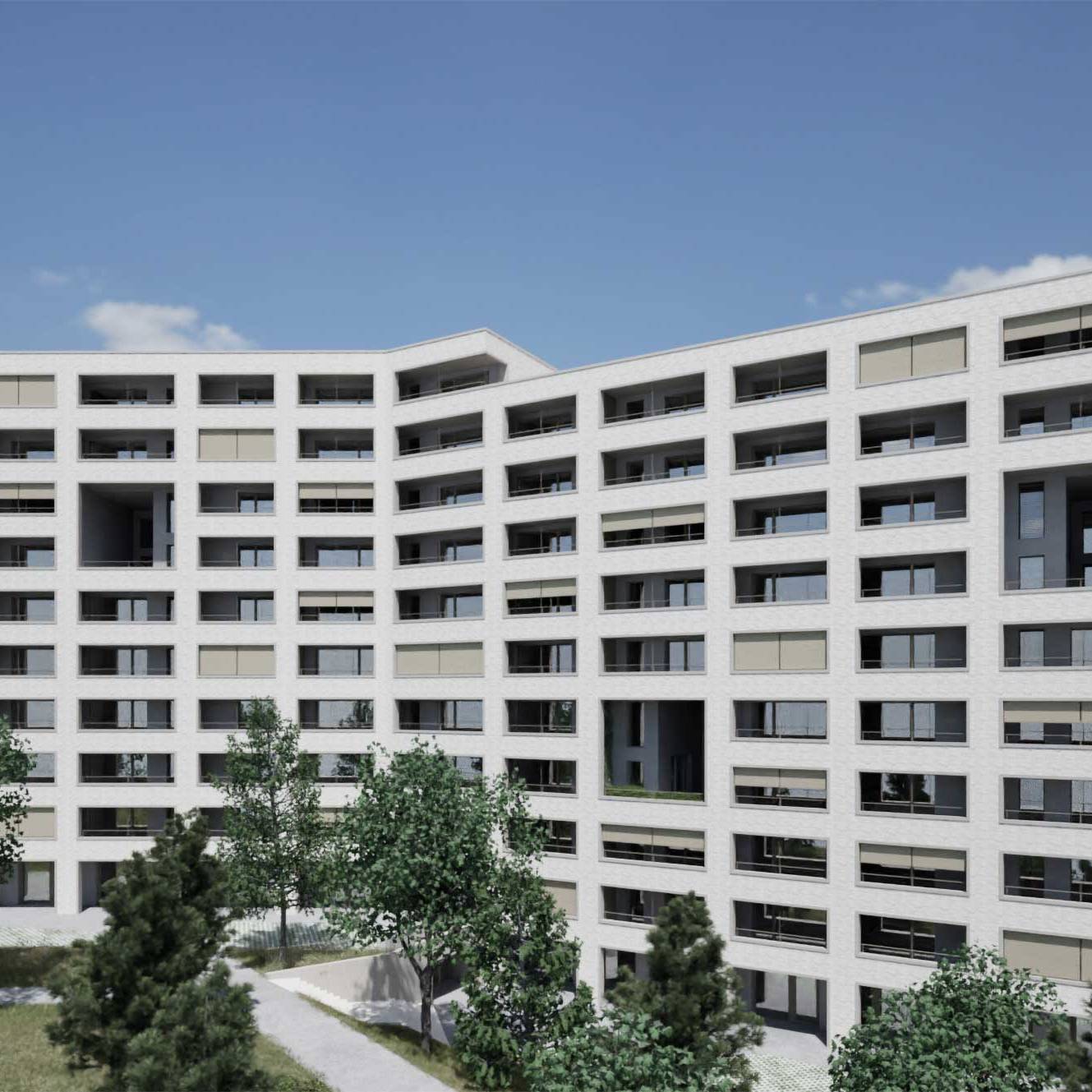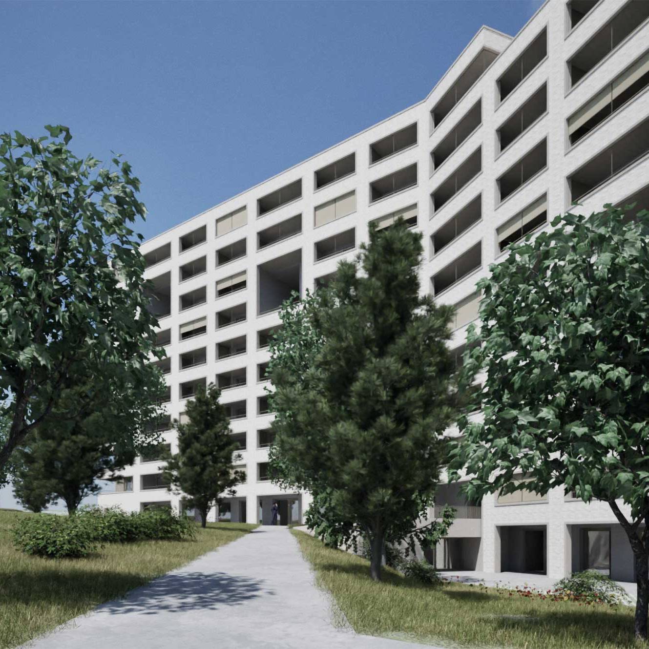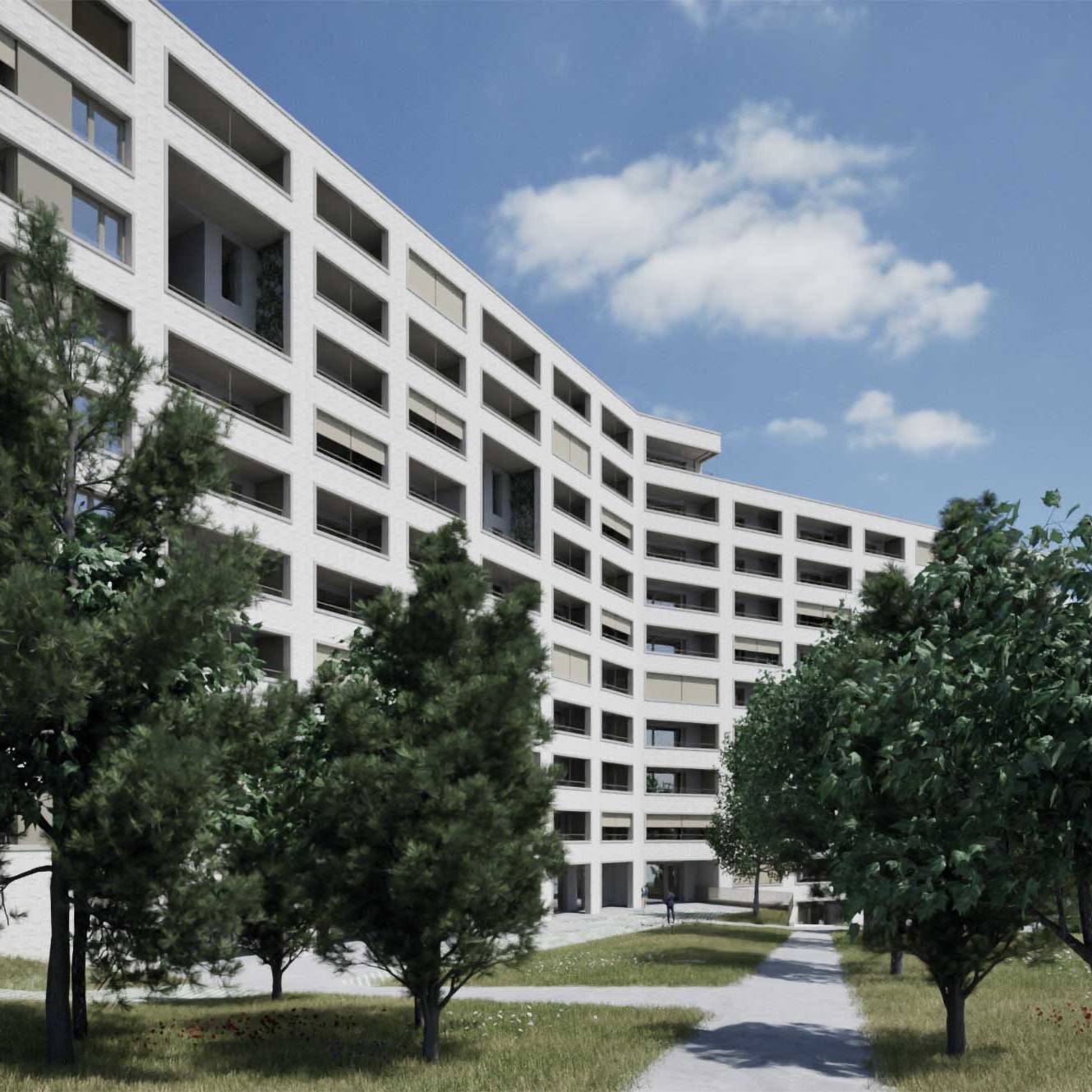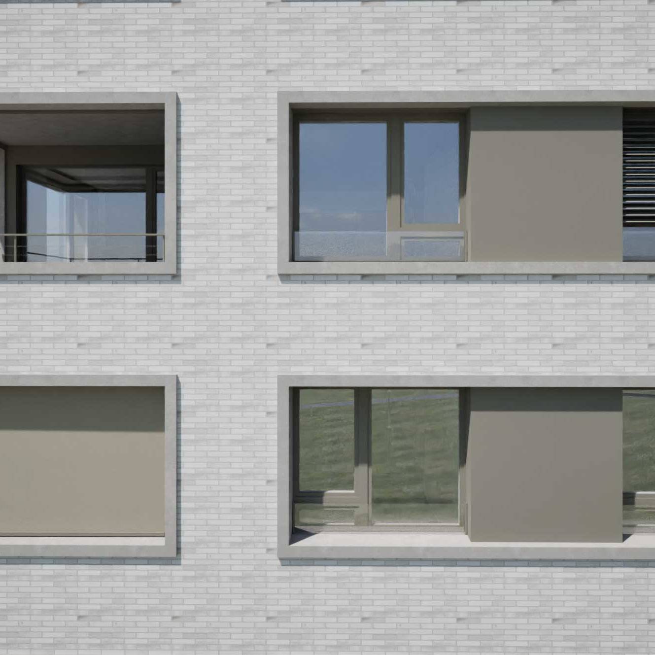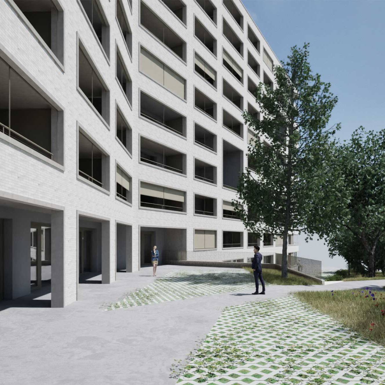 Avec sa volumétrie compacte et son implantation centrale, le bâtiment E devient un repère du quartier. Ses façades, animées par un jeu régulier d’ouvertures, offrent une lecture architecturale unifiée et contemporaine.