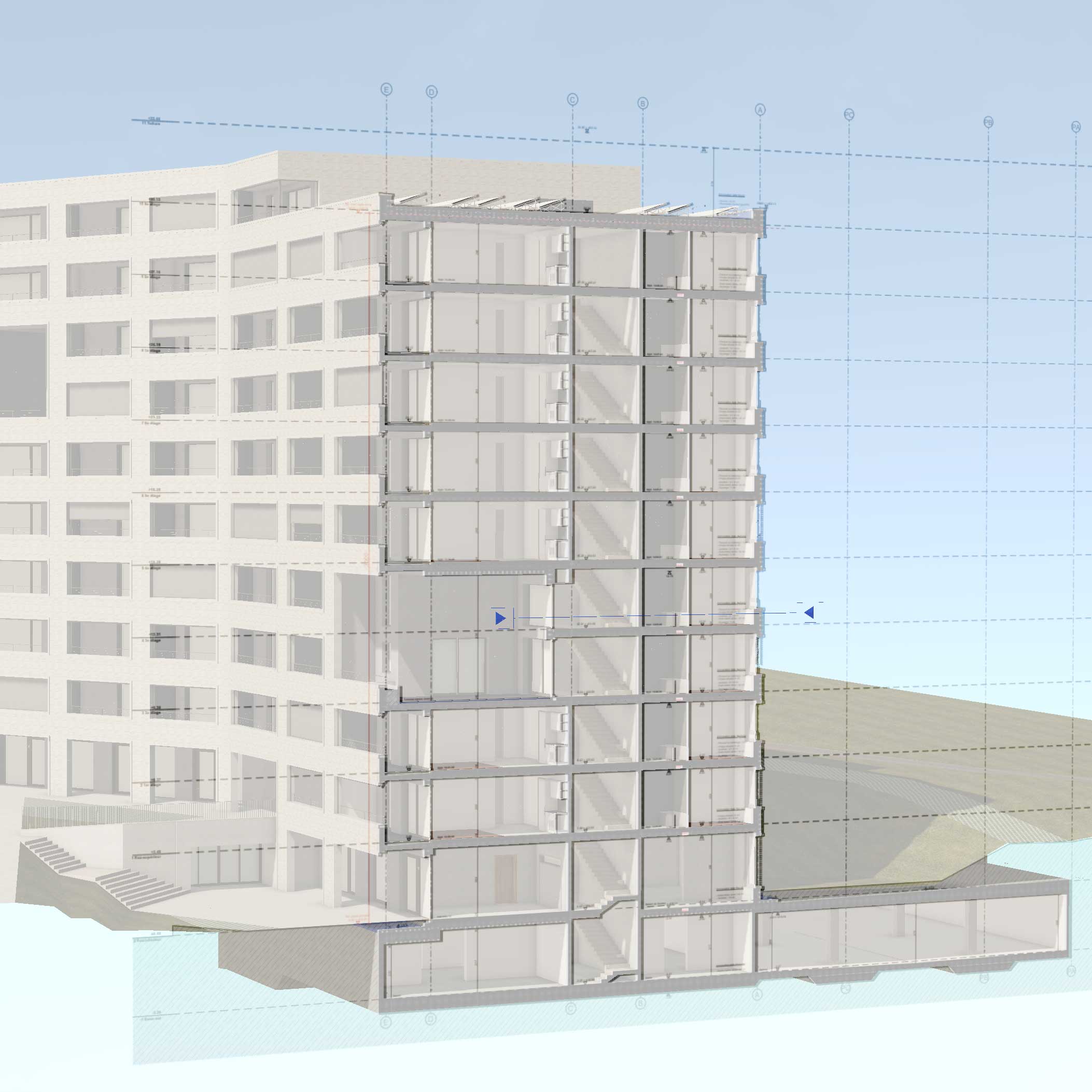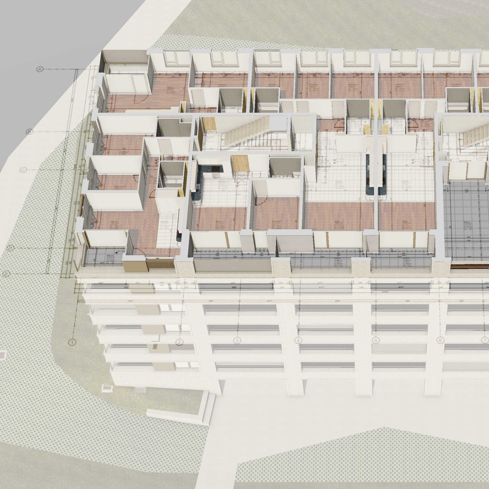Le bâtiment s’appuie sur une trame structurelle claire, avec des noyaux verticaux réguliers. Les logements, majoritairement traversants, sont orientés Nord-Sud : séjours au Sud, chambres au Nord, pièces d’eau regroupées autour des noyaux.